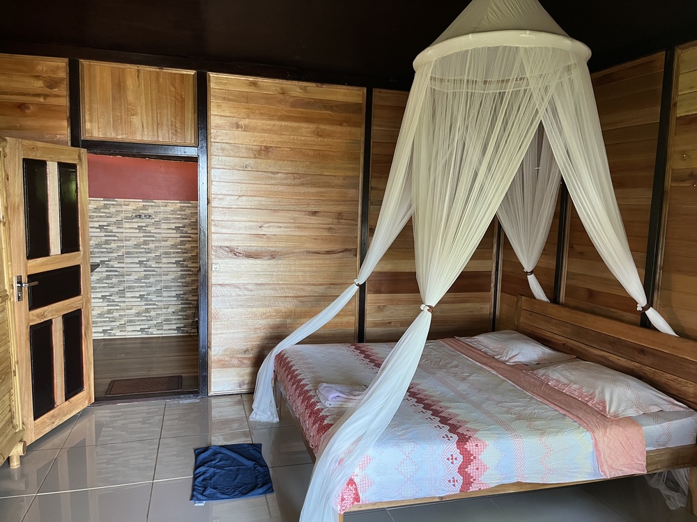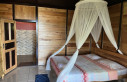Großzügige Holzbungalows, großen modernem, überdachtem Außenbad, Ventilator, Terrasse mit Sitzgelegenheiten und Liegen direkt vor der Tür. Direkter Blick und Zugang zum Strand. Schönes Doppelbett mit Moskitonetz.